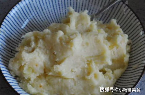 2、洋芋我們直接壓碎成泥狀,然後往裡面加入適量的食用鹽,再放入60克的麵粉攪勻。