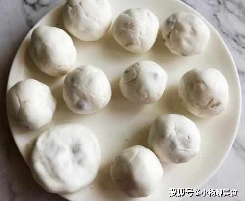 第二步:將麵團一小塊一小塊的捏出,按扁,接著將嵌入蜜紅豆包好,揉成小圓團後再次按扁,放入盤中待用。
