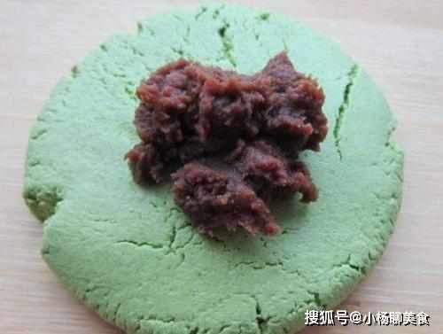 第二步:抓一把糯米粉裝入盆中,用菠菜汁來和麵,將其揉成一塊光滑的麵團,然後搓成長條,分成若干個小劑子,壓扁,包入豆沙,封口後搓圓再將其壓成餅胚。