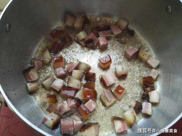 3、繼續燒鍋,往鍋裏倒入少許食用油滑鍋,將油燒熱後,下入臘肉,中火煸炒,將猪油煸炒出來。