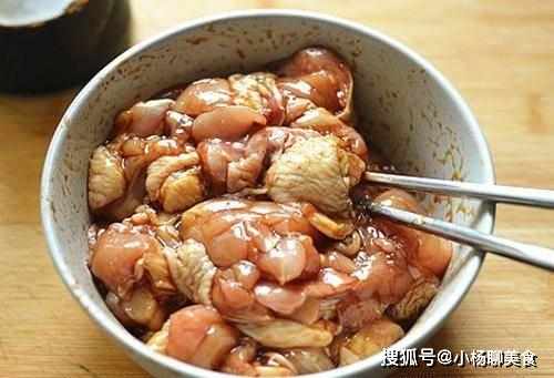 第二步:將焯過水的雞腿肉撈出裝入碗中,往裏加入適量生抽、料酒、食鹽和澱粉,用手將其抓勻,醃制一會兒。