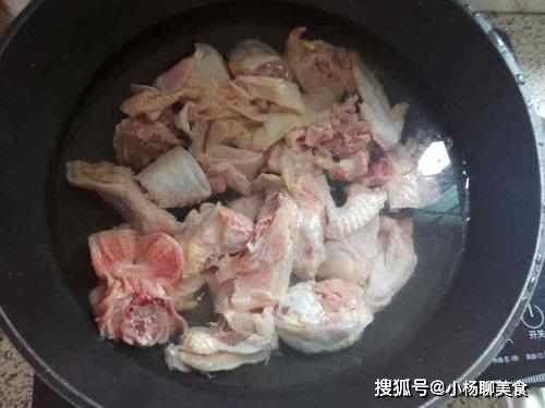 第一步:將買回來的雞腿洗淨剁成小塊,接著下入鍋中,加入適量清水,將雞腿肉進行焯水5分鐘。