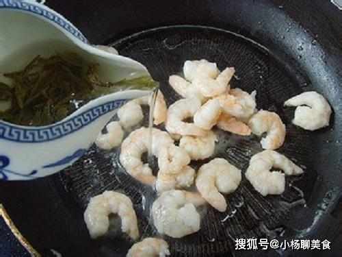 第四步:鍋裏繼續放油,燒熱,下葱爆香,放入蝦仁,接著倒入適量黃酒和泡好的龍井茶水及茶葉,顛鍋翻炒至片刻就能出鍋啦。