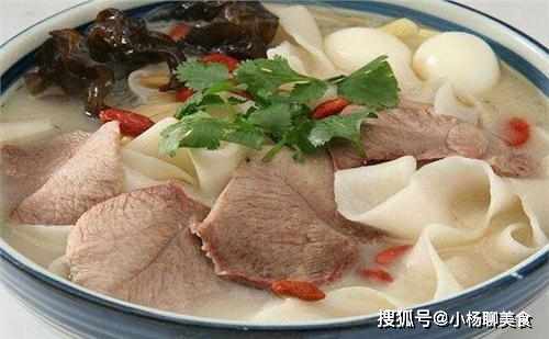 這是一碗對湯頭有著極高要求的麵條,光是湯料就得熬七八個小時,把羊骨、羊肉等食材熬成一鍋濃湯,隨後澆入又寬又厚的燴面碗裏,最後再撒上一把香菜,吃起來真是鮮美至極。