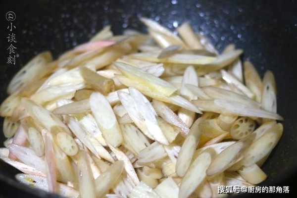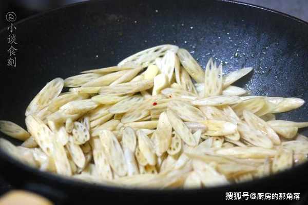 3、快速的翻炒,放入鹽加入香醋,再來點醬油,放點雞粉把它炒香炒至入味,這樣一道美味的熗炒藕帶就做好了。