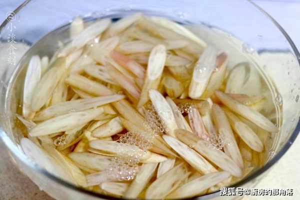 1、藕帶清洗乾淨,切成斜刀狀,大家一定要記住先清洗,然後再切成斜刀狀,這樣能够避免裡面有泥土而沖洗不乾淨。