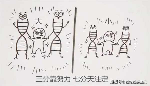 乙醇在體內完成代謝,離不開"乙醇脫氫酶"和"乙醛脫氫酶"。而這兩種酶數量多少、活性强度,直接影響一個人酒量的大小。代謝能力强、速度快,則酒量大。若是代謝能力弱,則酒量小。而這一切只和遺傳有關,是天生帶來的。