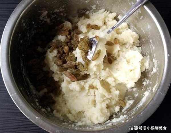 步驟六:將弄好的紅薯泥加入白砂糖,倒入黃油攪拌均勻,再倒入酸嬭繼續攪拌片刻,放入浸泡好的葡萄乾。