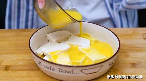 4.攪拌好的母雞蛋液倒在豆腐裏,儘量讓整個豆腐都裹滿蛋液。然後放入碗中備用。雞蛋液只要包裹住豆腐就可以了,切記不要使勁地攪動哦。