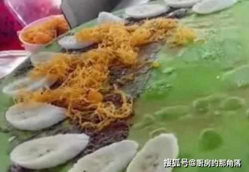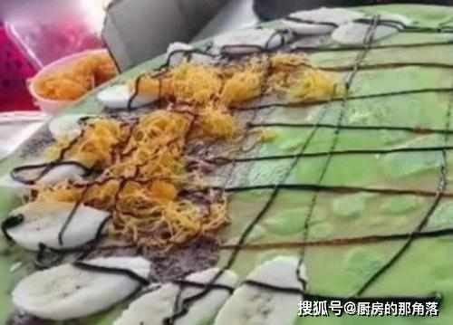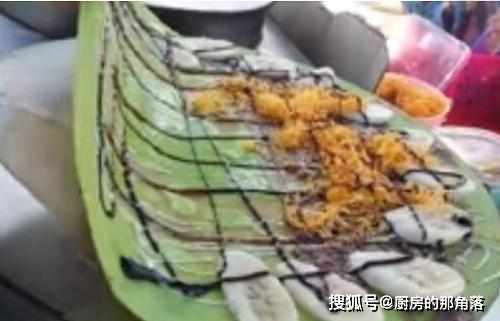 ,後面的做法和煎餅果子很像,先是把麵糊推開沾滿整個鍋底,然後裡面也要加什麼食材也是可以自己選擇的,就是食材有些比較與眾不同了,可以加水果之類的,還有下的醬料也比較不一樣,有巧克力醬、辣椒醬和番茄醬等,口味比較眾多,看個人喜好吧。