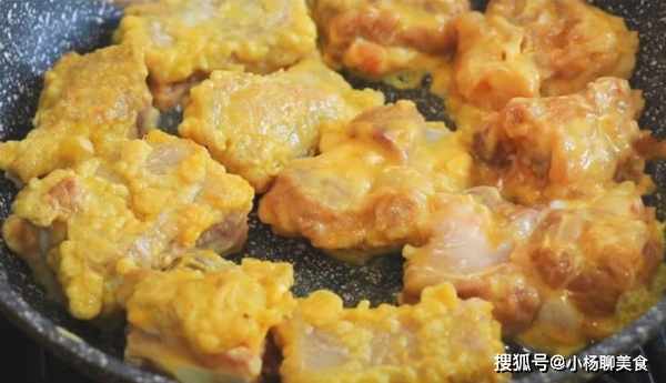 然後把雞蛋液均勻的倒在排骨上,然後進行攪拌。要保證每一塊排骨上都沾了雞蛋液。然後接著放入洋芋澱粉,不要太多2勺就好,繼續攪拌。