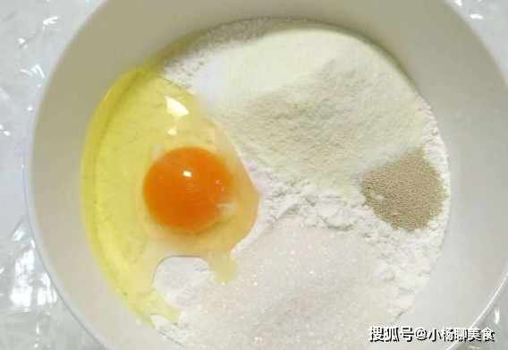 開始把奶粉,酵母,白糖雞蛋,鹽都倒入高筋麵粉中,接著在倒入牛奶,然後用筷子攪拌至麵團光滑無乾粉,在往麵包表層上一圈油,接著用保鮮膜把麵團蓋上。在發酵1個半小時。要放在溫暖的地方。可以選擇放進蒸鍋裏。這樣比較方便。