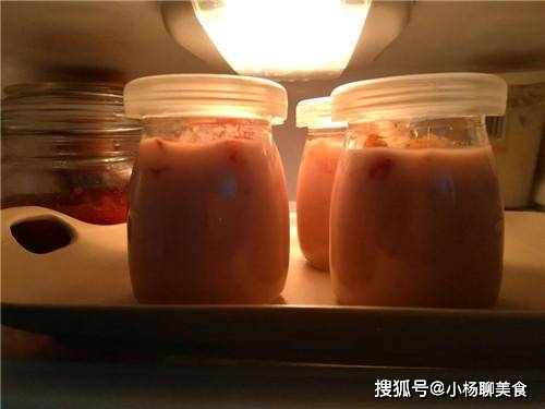 步驟三:在準備好這些後,將剛才煮好的牛奶等液體,倒入容器中(可以自己决定用什麼)。再倒入其中之後,我們在上面擺上一些草莓,接著直接將放冷的容器放入冰柜中,等到液體都凝固之後就可以拿出來吃了。
