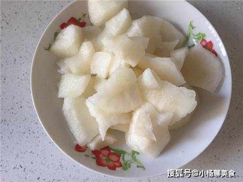 步驟一:首先將準備好梨用清水先洗乾淨,然後將梨用鹽輕輕的搓洗下,直到將梨的身上的蠟沖洗乾淨後,用清水洗掉。或者大家也可以直接將梨的皮削掉,然後切成塊。如果切好的裏不是馬上就煮,建議可以放入清水中。