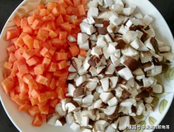 第二步,香菇切丁,幹姬松茸事先泡水,胡蘿蔔切成丁,大蒜切成末,夾子肉用刀剁碎,炒鍋中添上少許油,放入蒜末煸香,放入豬肉餡,炒至變色後;