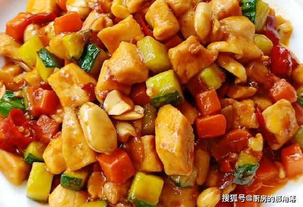步驟一:將雞胸肉洗淨後切小塊放入碗中,往碗裏加上適量的胡椒粉、料酒和澱粉抓勻之後醃制一會。拔花生放在鍋裏幹炒一下,炒熟之後去皮。黃瓜和胡蘿蔔洗淨切小丁。