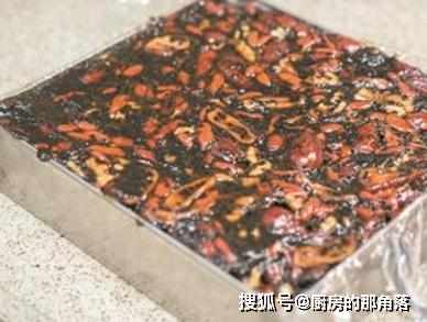 步驟五:模具用保鮮膜裹好,在上面刷一層香油,將鍋中的食材趁熱倒入模具中,用木鏟抹平和壓實,待晾凉後即可放入冰柜冷藏,阿膠糕成型後倒出模具,切條或切片後即能裝盤食用。