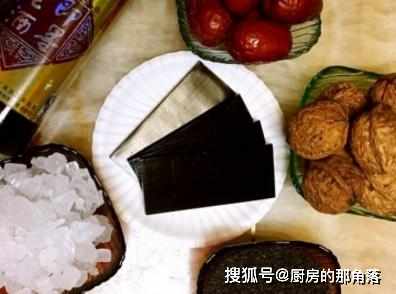 步驟一:將準備好的食材清洗乾淨,阿膠需要提前兩天泡好(跑阿膠時使用即墨老酒,用保鮮膜封好口,避免黃酒揮發完,泡的期間要時常攪拌),要等黃酒把阿膠完全泡化就能够熬膠了呢!
