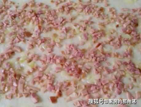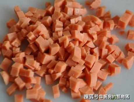 第四步,火腿腸撕去包裝後,切成碎丁,這個時候,麵團基本上發酵至2倍大了,移至案板;