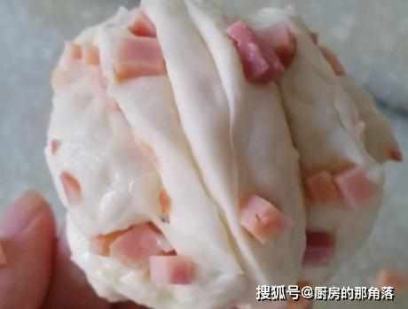 第六步,並且撒上切好的火腿碎,從上往下捲曲,捏緊收口處,用刀切成等份的小面卷;