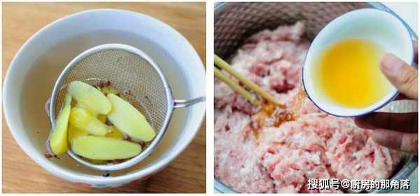 做肉餡兒時,也不要先放鹽。準備少許花椒和生薑,下鍋煮5分鐘,取煮好的水,倒入肉餡兒裏。然後沿著一個方向攪拌上勁,一斤肉餡兒大概可以倒入100克花椒水。然後攪拌均勻,感覺出膠質感了,就放入冰柜冷藏一會。準備包餃子之前,取出來放鹽攪拌均勻。