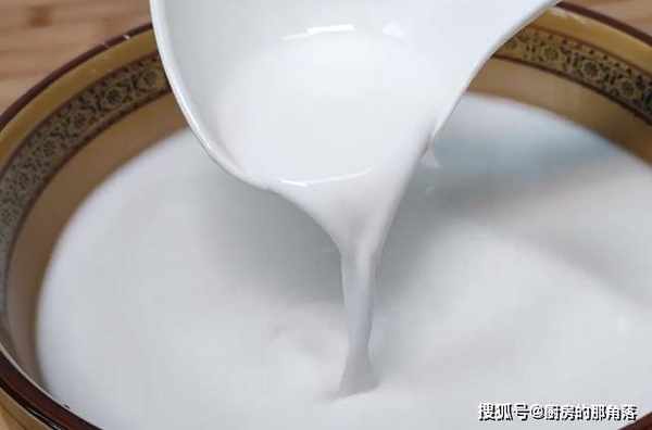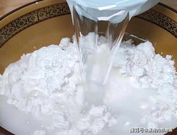 2.另取一個碗放入和澱粉等量的清水,然後將清水倒入澱粉中,攪拌至沒有幹澱粉狀態,攪拌至如圖所示流水狀態即可。