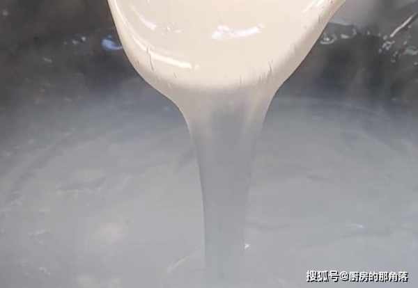 3.炒鍋洗淨,取同樣大小的碗倒入5碗清水放入鍋中。此時澱粉和水的比例為1:6,然後我們開大火將水燒開。水開後改為中小火,然後將澱粉緩慢地倒入水中,這一步我們一定要不停到攪拌,至澱粉逐漸濃稠時而且變成透明狀,就可以啦!