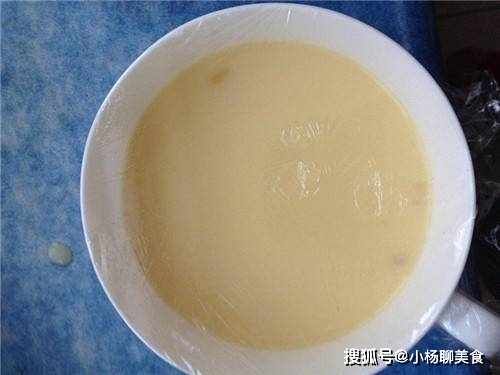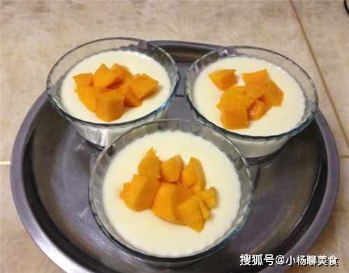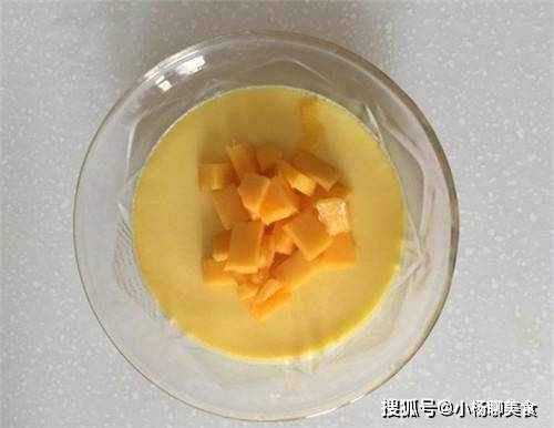 步驟三:然後在碗上蓋上保鮮膜,並且放在蒸鍋中蒸上10分鐘就可以拿出了。接著就可以拿出芒果,並且將芒果用刀切成小粒後,放在布丁上,用於裝潢,不僅好吃而且也十分的好看,除開芒果外,火龍果、蘋果也都可以放。但是玉米和水果建議只放一種,以免串味。