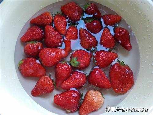 步驟一:拿出要做草莓醬的草莓分量,然後先什麼都不管,直接將草莓倒入水中,並且在水中加上一點點的鹽。接著讓草莓就泡在水中,泡上15分鐘後就將草莓從水中撈出。接著將草莓再次清洗一次,接著將草莓的蒂去掉,並且將草莓切成幾瓣放在碗中。