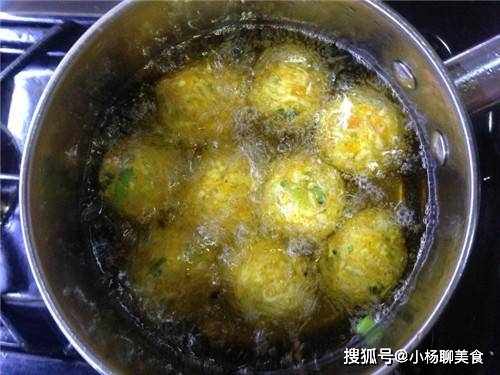 步驟三:在鍋中倒入適量的油,並且先開火將油燒熱,在5層油溫時,關上火。然後抓起麵團,將它從虎口處擠出丸子。然後把丸子放在剛才的油鍋中,等到丸子全部都放進去後,就開中火。並且炸的時候順帶翻動下丸子,直到丸子變得金黃色就能撈出了。