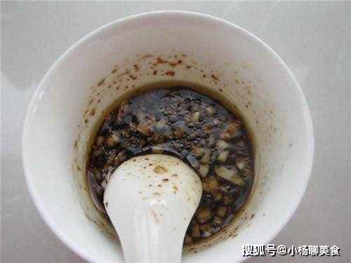 步驟二:在豆芽還處於準備工作時,就可以準備調料了,拿出一個小碗,先倒入一點點的油,接著加必備的生抽以及辣椒粉,然後倒入一點點的醋和湯,最後倒入已經切好的碎末。接著快速的將調料拌勻,並且等待豆芽。