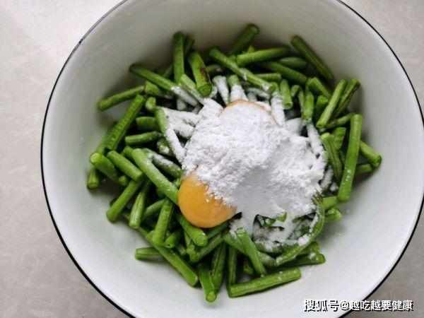 1.豆角一小把將其放在清水中洗淨,然後切成小段放入碗中。裡面打入兩個母雞蛋黃,再加入一小把的地瓜澱粉。用筷子將其攪勻。
