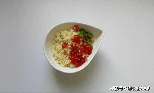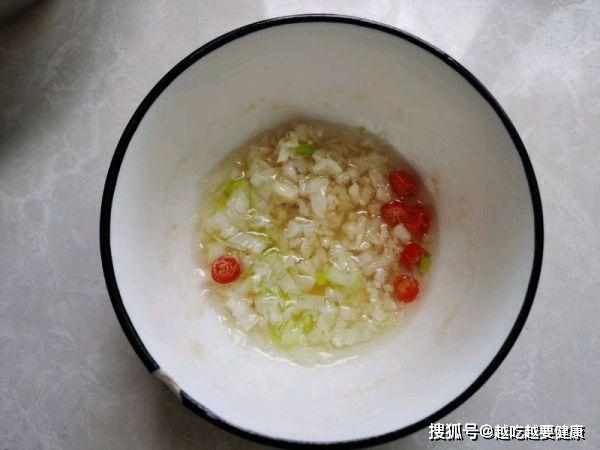 大蒜兩瓣將其切成蒜末,小米辣一顆切圈,在裡面澆入一勺熱油。激發出料頭裡面的香味。然後加入生抽、陳醋調味就可以啦。