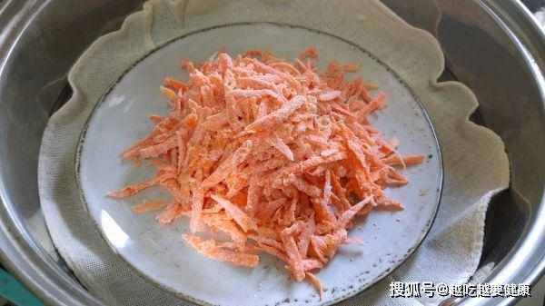 2.往胡蘿蔔裡面加入少許的精鹽,以及中筋麵粉。薄薄的一層麵粉就可以啦。用手給它抖散開。蘿蔔條之間只要不粘連在一起就可以啦。直接開水上鍋蒸十分鐘,十分鐘後就可以出鍋裝盤啦。