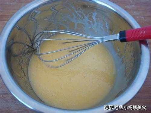 步驟一:準備一個乾淨的,並且大一點的盆,然後在盆中倒入打入1個雞蛋,接著在雞蛋中倒入110g的玉米油,然後先別急著攪拌,先加上120g的綿白糖。然後就可以開始攪拌了,將這三樣食材快速的攪拌均勻。