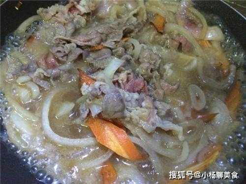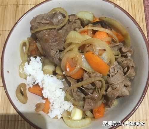 步驟三:倒入油後,先炒配菜,將配菜依次下入鍋中,將洋葱炒香後倒入胡蘿蔔,然後快速的拌勻,並且在炒好後,將肥牛倒入。接著剛才的調料倒入,並且在炒上1分鐘後在鍋中加上熱水,煮上一會後,就可以關上火,並且將菜鋪在飯上面,然後在淋上湯汁就行了。