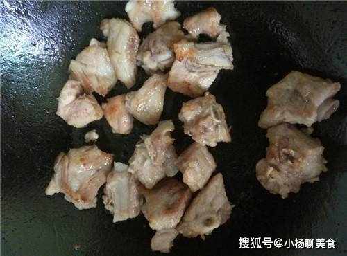 步驟二:接著將鍋洗乾淨,並且將鍋先預熱一下,然後將瀝幹水分的排骨倒入鍋中炒一下,或者說煎一下,等到排骨在鍋中變成金黃色後,就可以停止了。(這是為了讓排骨更加的香,並且是為了炒掉水分,同時因為排骨會出油,就不用放油)。