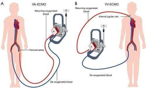 ECMO通過引流患者靜脈血至體外,經過氧合和二氧化碳排除後回輸患者體內,承擔氣體交換和(或)部分血液迴圈功能。主要有兩種模式:靜脈到靜脈ECMO(VV-ECMO)與靜脈到動脈ECMO,(VA-ECMO),前者將靜脈血(一般選擇股靜脈)引出體外,使血液與氧氣結合後泵回體內,通過頸內靜脈最終注入右心房,以輔助呼吸;後者則完全繞過心臟與肺臟,將靜脈血(股靜脈)氧合後泵到動脈(同側或對側股動脈),減輕心臟的負荷,輔助呼吸和迴圈,尤其用於心臟無法工作時,目標是滿足患者重要臟器的供血。ECMO的使用一方面結合患者的病情、年齡、體重等,另一方面需要專業的ECMO團隊。