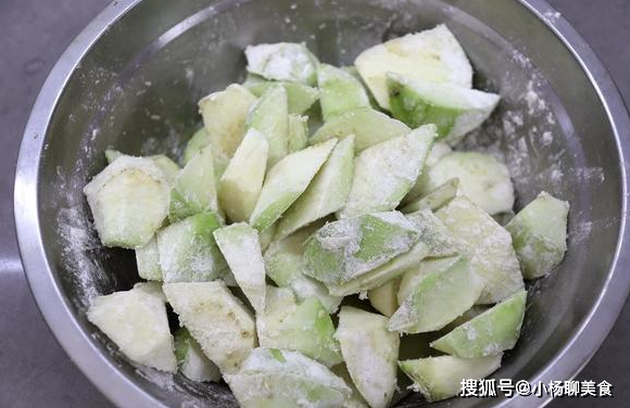 茄子切好後,不應該用水泡,或者用鹽醃,這都是不正確的。應立即撒上一層麵粉,無需裹太多麵粉,薄薄的一層就可以了。茄子表層裹上一層麵粉,它可以防止氧化。