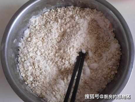 第一步,首先準備一個容器,將小麥粉、燕麥粉和酵母粉混合拌均勻,然後準備出適量的牛奶,將其置於煮鍋中加熱至30度左右的時候,將其分次少許倒入混合好的麵粉中;