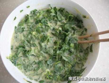 第二步,直接在芹菜葉中加上點麵粉,碗中磕入1個雞蛋打散後加入芹菜葉中,同時加上點食鹽和十三香調味,水分次少許慢慢加入其中,一邊加水一邊攪拌;