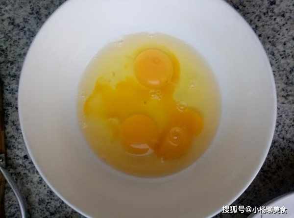 第二步:取三個雞蛋,打入碗中,攪拌均勻,製成雞蛋液。
