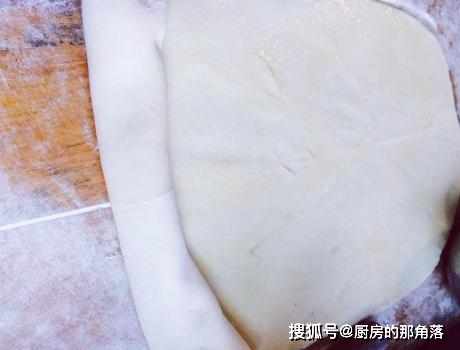 第三步,在面片上撒少許的食鹽,然後再均勻塗抹薄薄一層食用油,朝著一邊將其卷起成面卷,面卷再從一邊開始盤起來,末端壓在餅的底部;