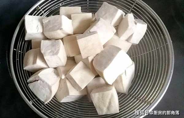 第一步。去豆腥。把豆腐切成小方塊,下鍋焯水,加一點鹽,煮1分鐘左右。目的煮出豆腐裏的水分,去除豆腥味;還能讓豆腐更緊實,不易散碎。這個小技巧很實用。