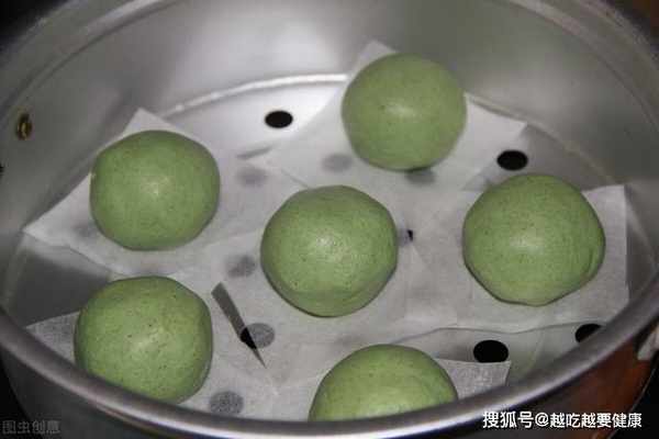 6、下麵準備上鍋蒸了,往蒸籠上放幾張油紙,然後把青團放到紙上,開始蒸。全程大火蒸,把水燒開之後再繼續蒸15分鐘,就可以出鍋了。
