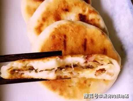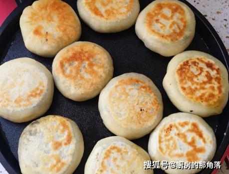 第五步,醒好的麵團移至在案板上,分成大小適中的面劑子,擀成和包子皮差不多大小的片,放入適量的餡料,捏成餅狀,鍋中添油,放入餅,煎熟後即可盛出享用。
