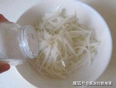 第三步,白蘿蔔用流動的水洗乾淨泥土後,削去蘿蔔的皮,切成稍微細一點的絲,然後加上適量的食鹽,用手將其抓拌均勻後,醃漬一會,將其中的水分醃漬出來後,瀝幹水分待用;