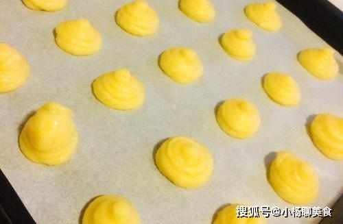 攪拌的差不多後,我們可以用筷子挑起麵糊,如果此時的麵糊能垂下卻不脫落,那就說明攪拌成功了。接下來我們可以用菊花形的花嘴把麵糊擠進鋪有錫紙的烤盤上。