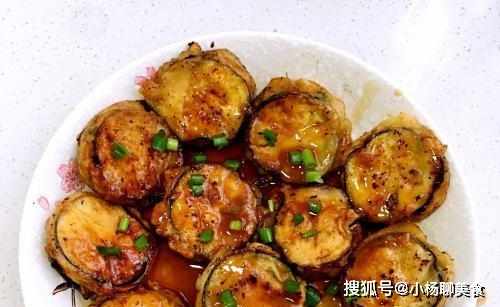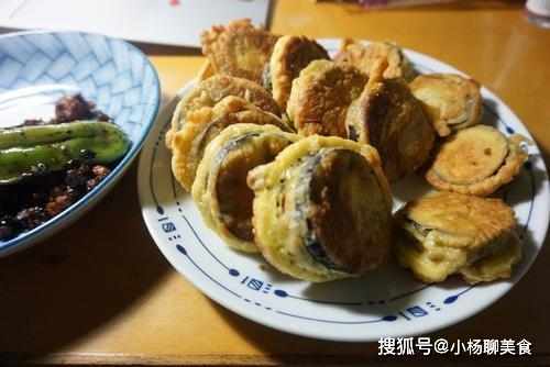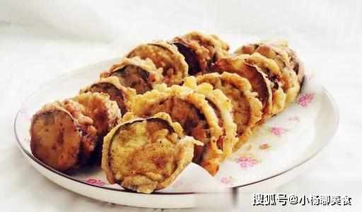 3、起鍋熱油,茄子包裹蛋液與麵糊後下鍋,炸到表面酥脆即可翻面,兩面炸到金黃只有即可撈出,所有的茄盒都炸好之後,我們再重新回鍋複炸一次,菜品就烹製完成了。