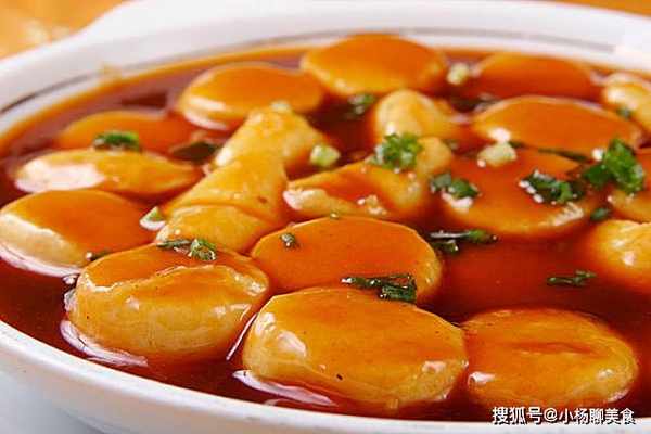 2、日本豆腐放到生粉裡面打滾,表層裹上了麵粉之後將其下油鍋,炸到焦黃之後撈出待用。另準備上一碗醬汁:半碗清水、半勺澱粉、少許食鹽、陳醋一勺、胡椒粉小半勺、生抽一勺、香油一勺、白糖小半勺攪勻。